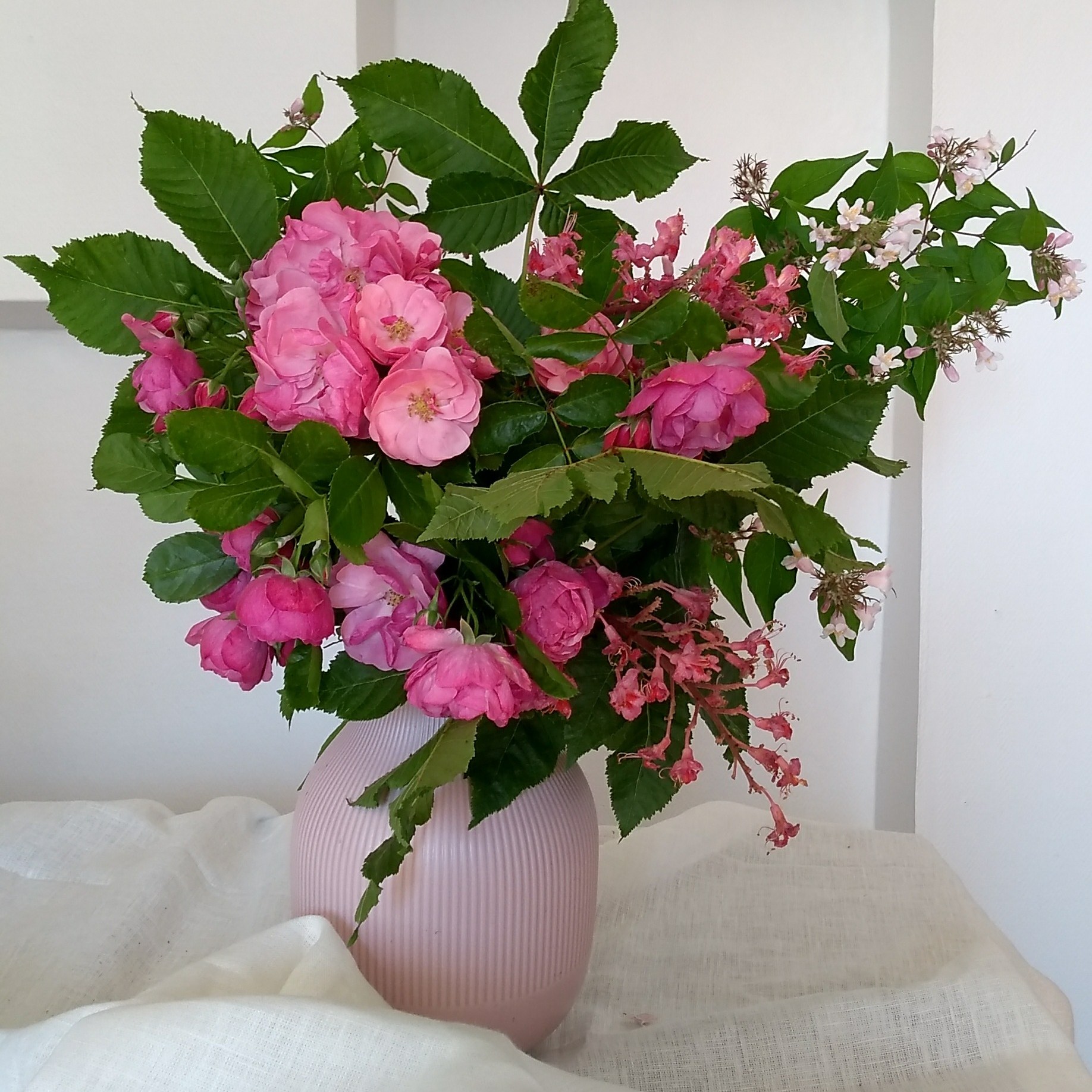 Un bouquet tutto rosa per gli animi romantici o semplicemente per godere de “la vie en rose”. Ho scelto tre tipologie di fiori che sbocciano in Maggio : le rose, fiore di maggio per eccellenza, il fiore dell’albero dell’ippocastano e la sinuosa Kolkwitzia. Pochi elementi per un voluttuoso risultato !