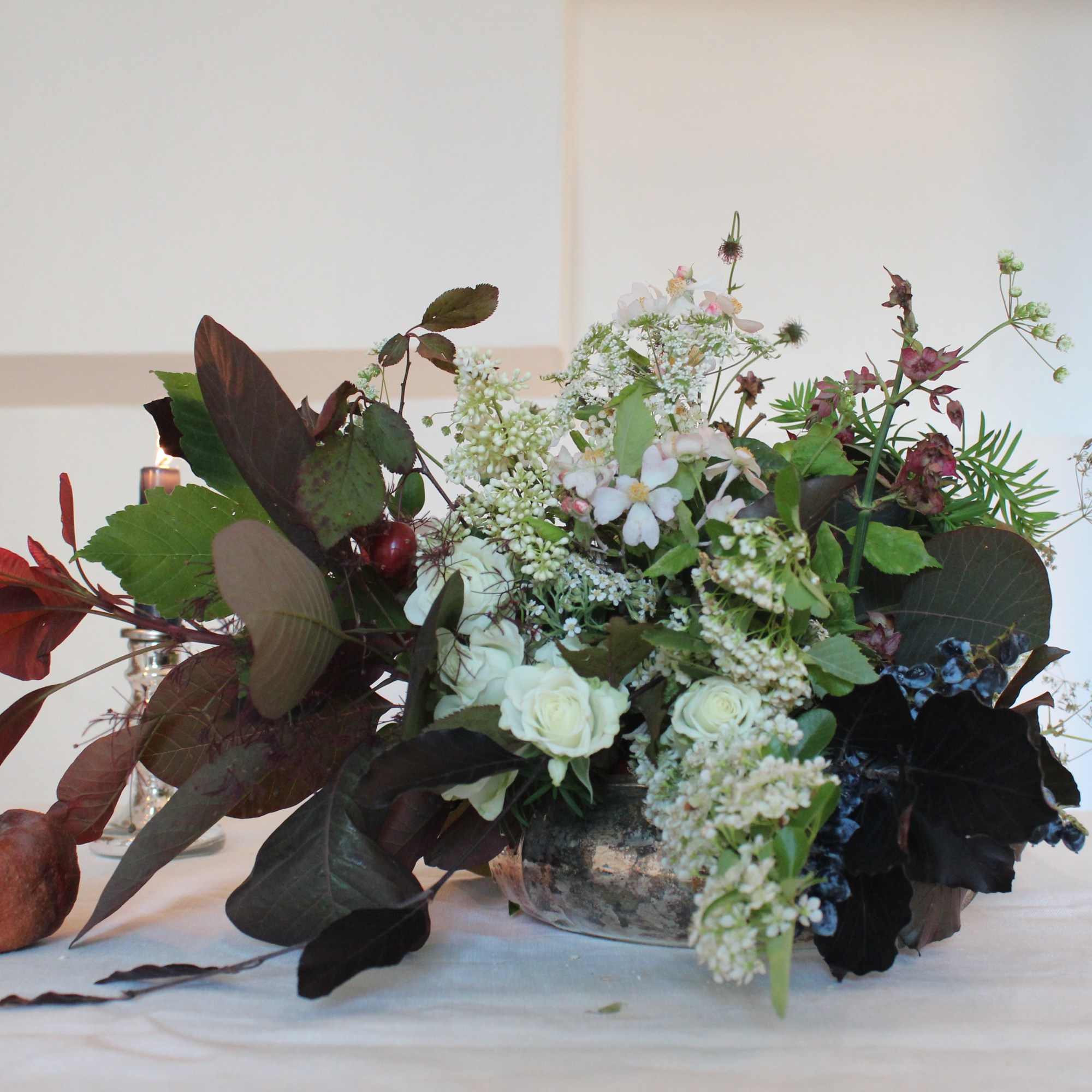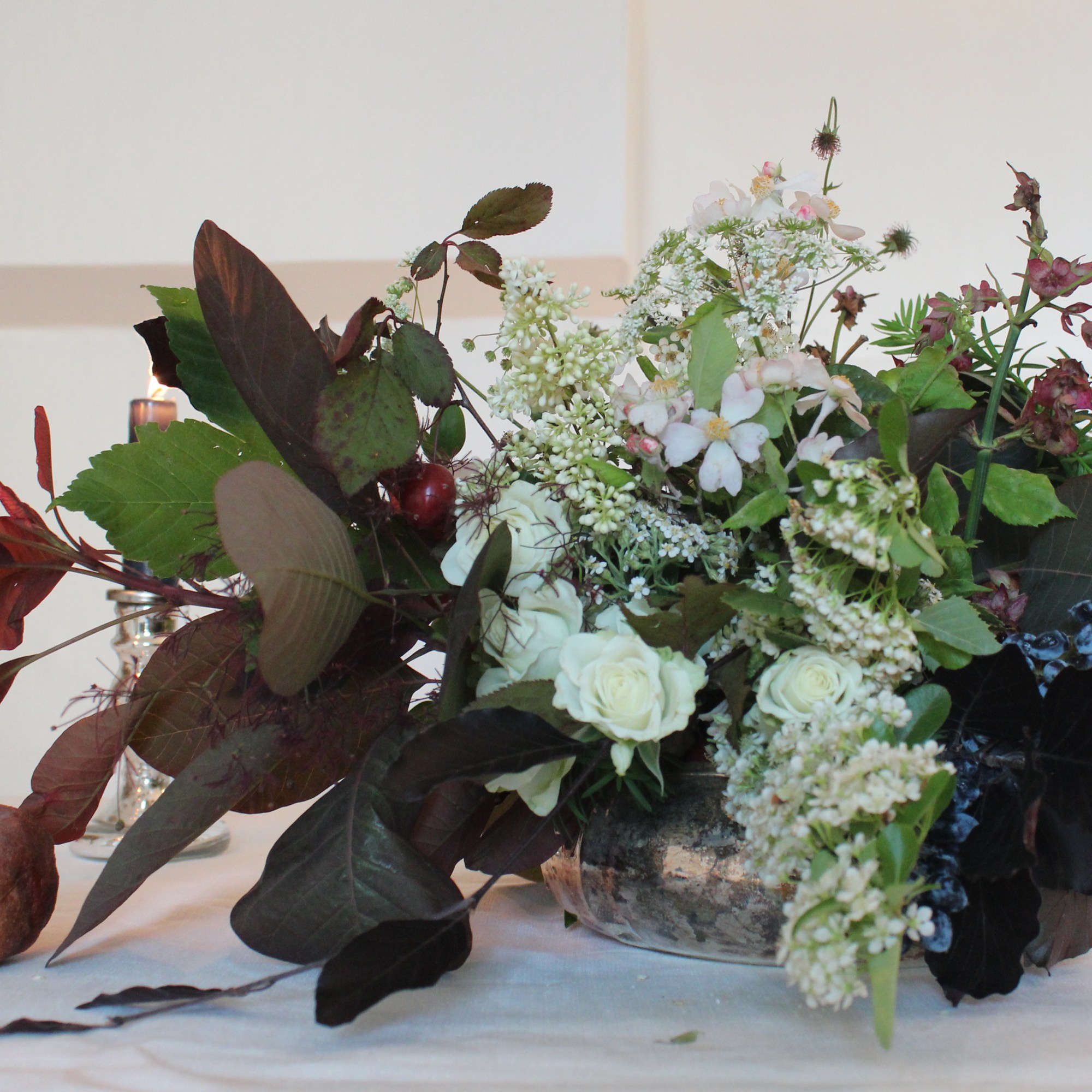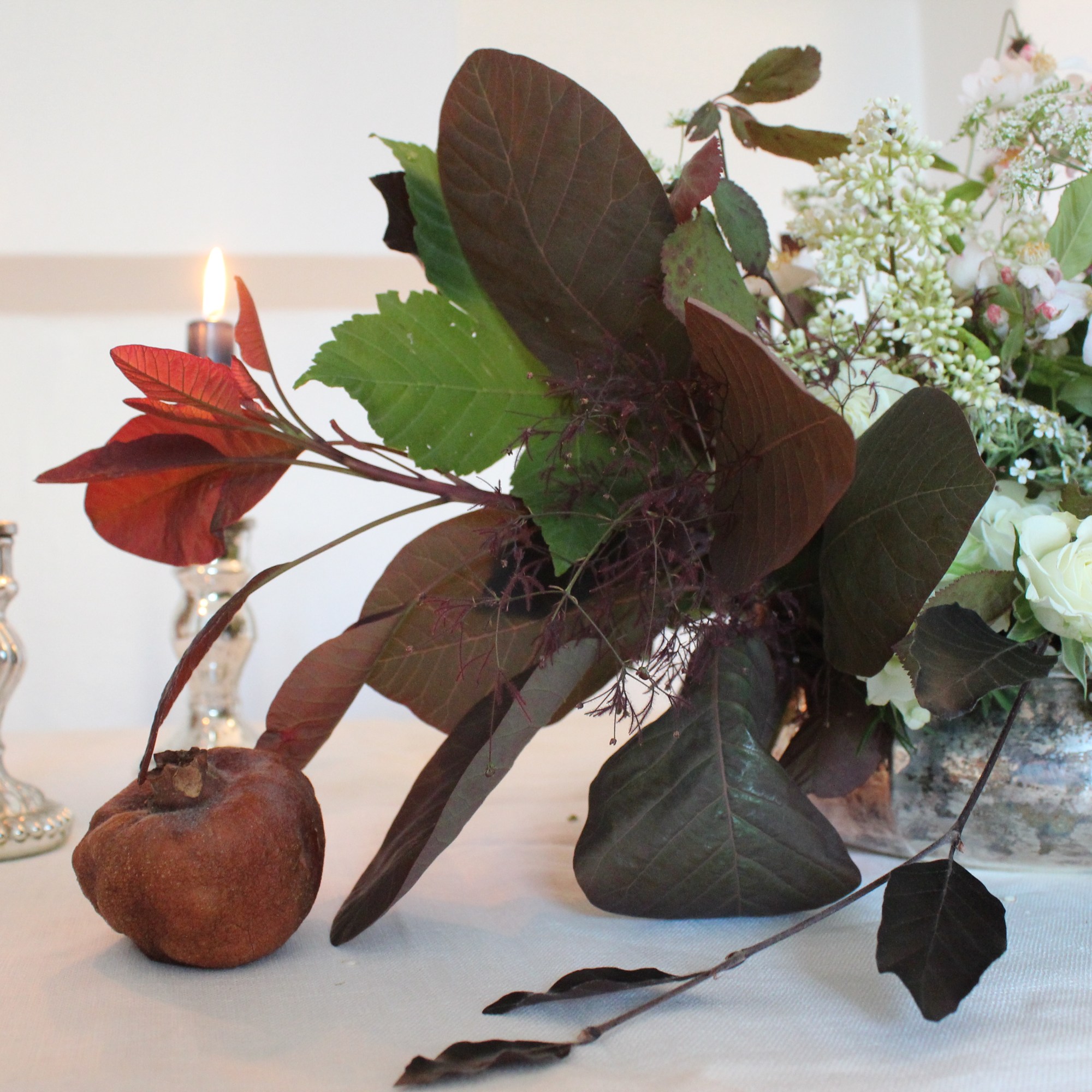 Iniziate posizionando il vostro flower frog* al centro della ciotola in argento, fissandolo con un po’ di plastilina al fondo. Assicuratevi che la ciotola sia ben pulita e asciutta. Questa composizione floreale dev’essere tenuta “bassa”, non deve cioè svilupparsi in altezza per non disturbare la visuale ai commensali : partite quindi con una base costituita da foglie e infiorescenze di Sommacco bordeaux e rametti di Faggio, le cui foglie sono di un color fegato molto intenso, tendente al nero (stupendeeee!).