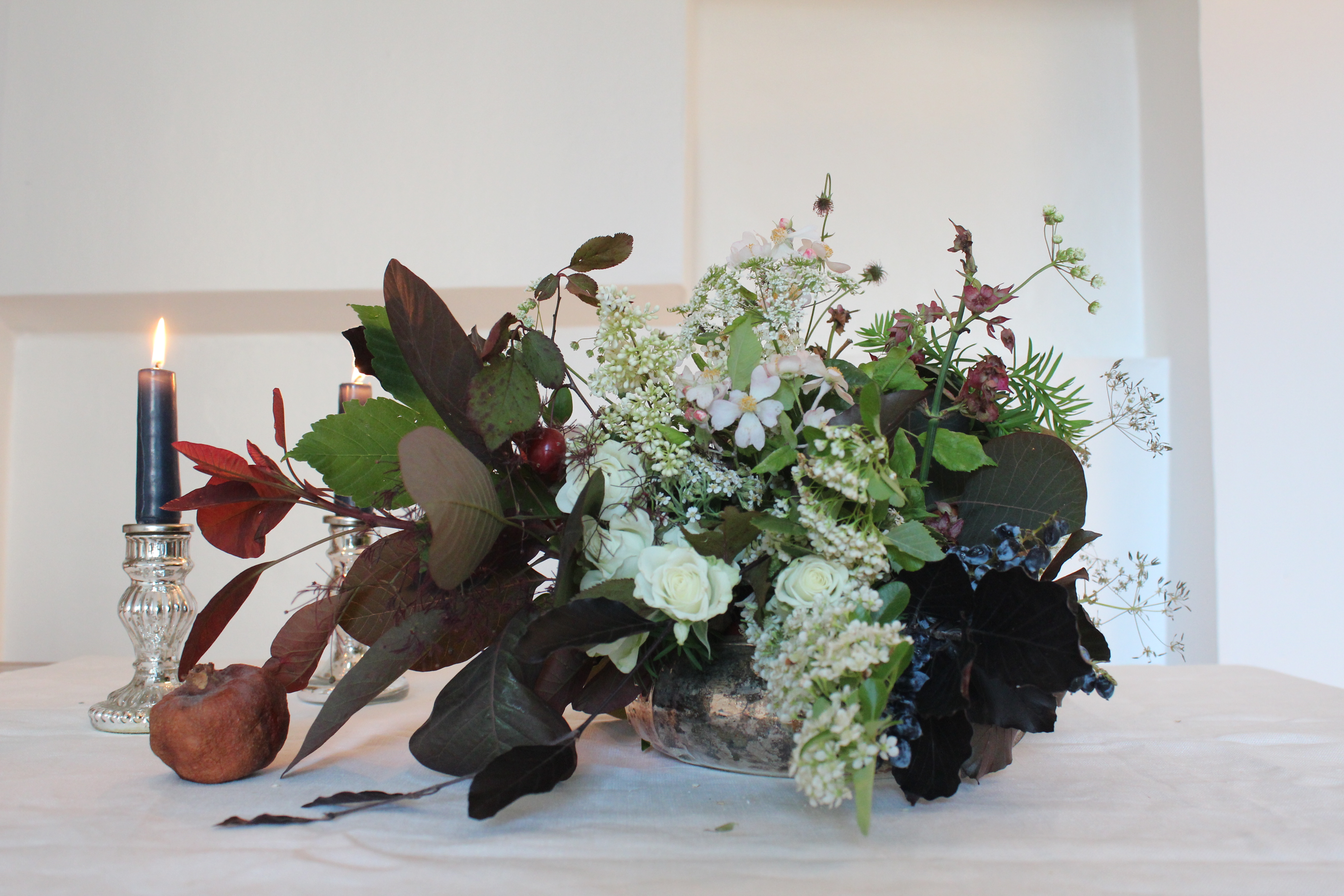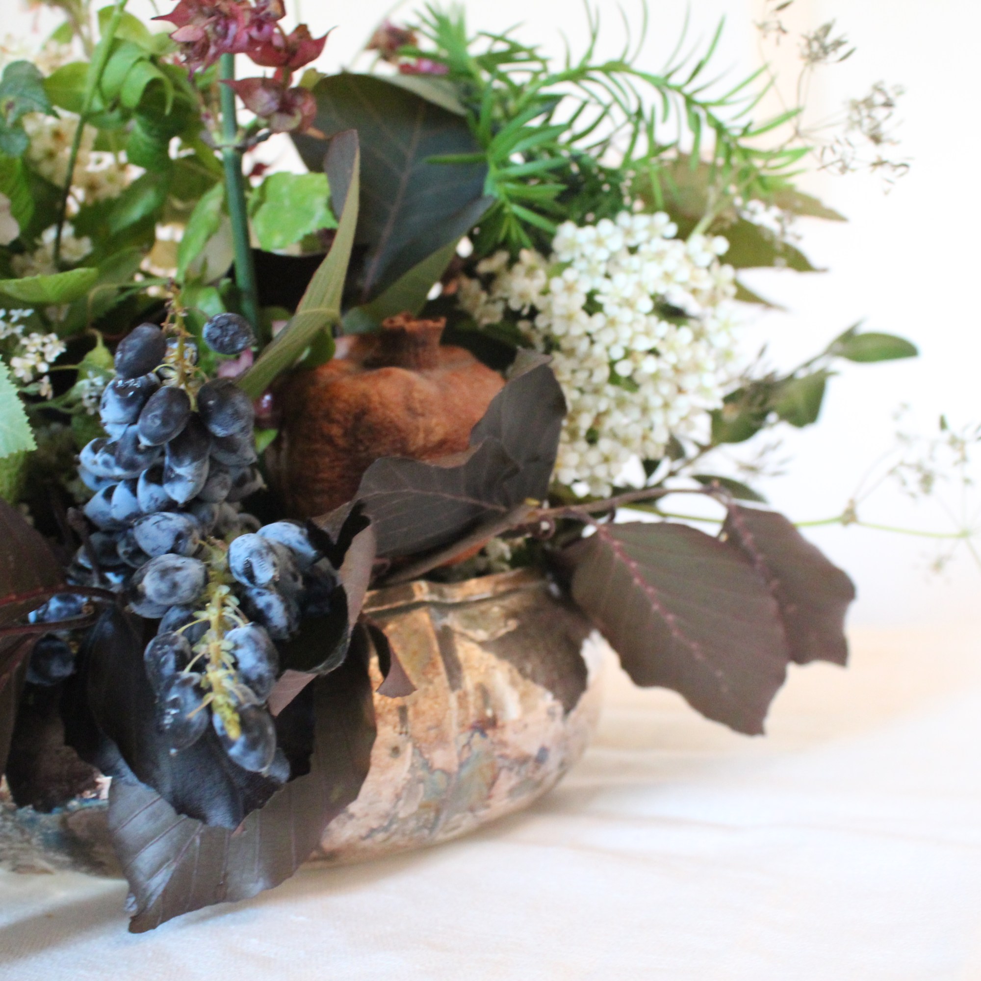 Per terminare, ho riempito qualche spazietto con dei rametti di Bosso e di Tasso, dai verdi scuri e intensi; ho aggiunto un paio di foglie di Acero montano dal gambo rosso scuro, dei Ranuncoli di campo sfioriti (i fiori sfioriti sono bellissimi! per esempio i ranuncoli sfioriti formano delle palline spinose molto resistenti) e last but not least frutta e bacche (ADORO). Ho inserito del Prugnolo (le prugnette rosse sono adorabili), un Melograno che avevo fatto esiccare lo scorso anno e delle bacche di Maonia, di un blu intenso, che ho fatto ricadere dalla ciotola. Amo molto mescolare fiori e frutta. Mi ricorda le nature morte dei pittori fiamminghi o i quadri del Caravaggio.