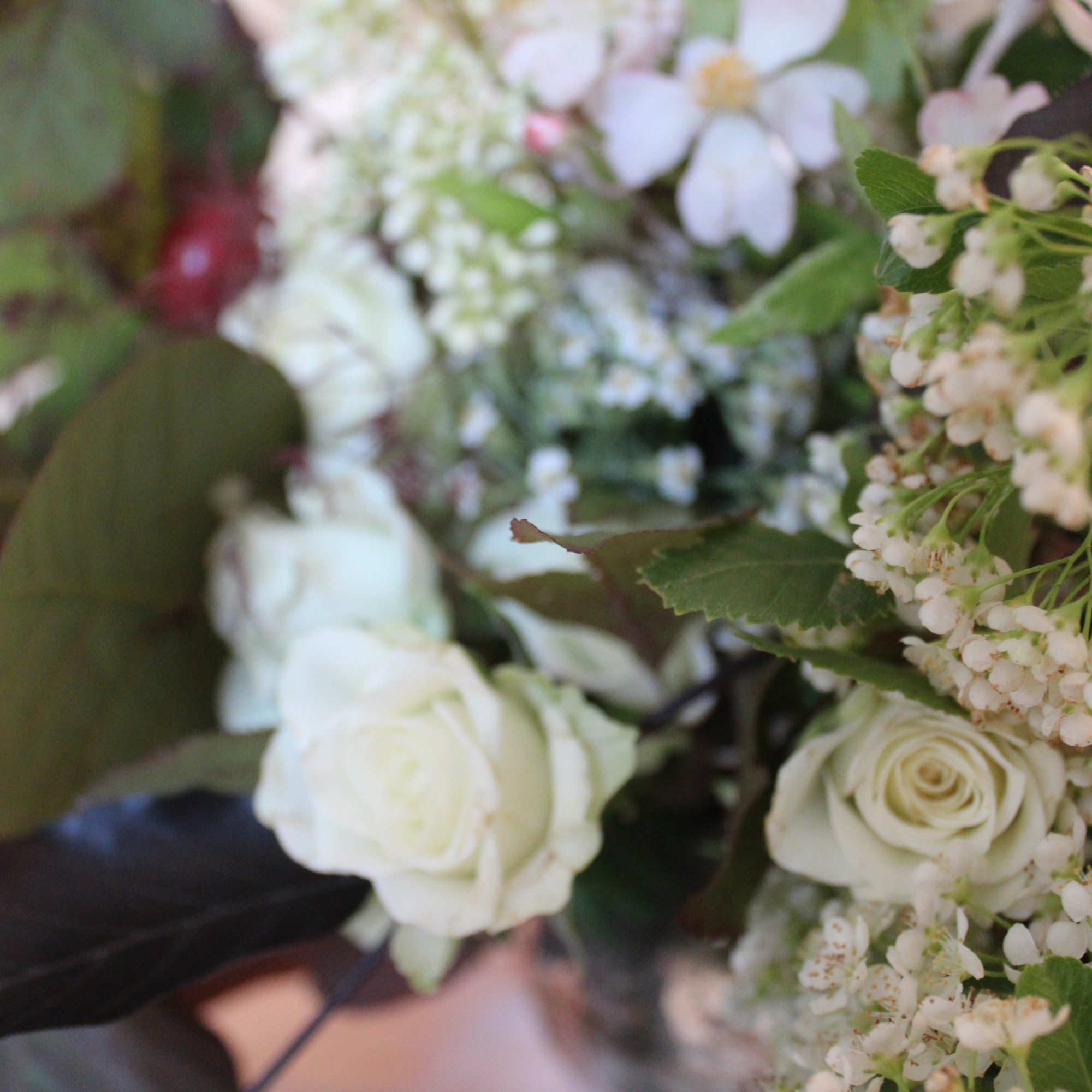 Una volta creata la vostra shape, potete iniziare ad aggiungere mano a mano gli altri elementi : personalmente mi piaceva l’idea di creare una sorta di sfondo vegetale di colore molto intenso per far risaltare i fiori color crema che costituiscono uno dei focus della composizione floreale. Ho scelto di accostare delle Roselline panna (ma mi sarebbero piaciute anche delle rose da giardino o una peonia), del Ligustro (profumatissimo), un piccolo ramo di Rosa Canina, uno stelo di Achillea e del Cerfoglio selvatico (questi ultimi sono fiori rustici ma danno un tocco di spontaneità e leggerezza), del Biancospino in fiore.