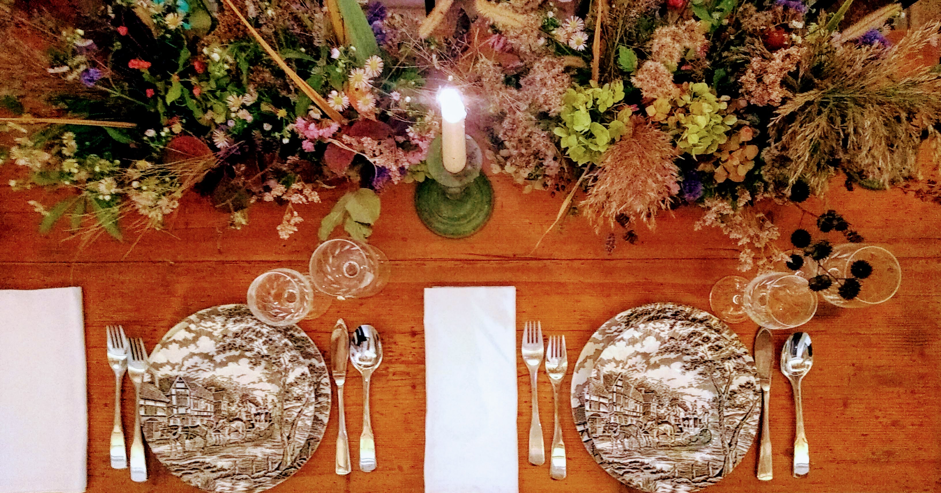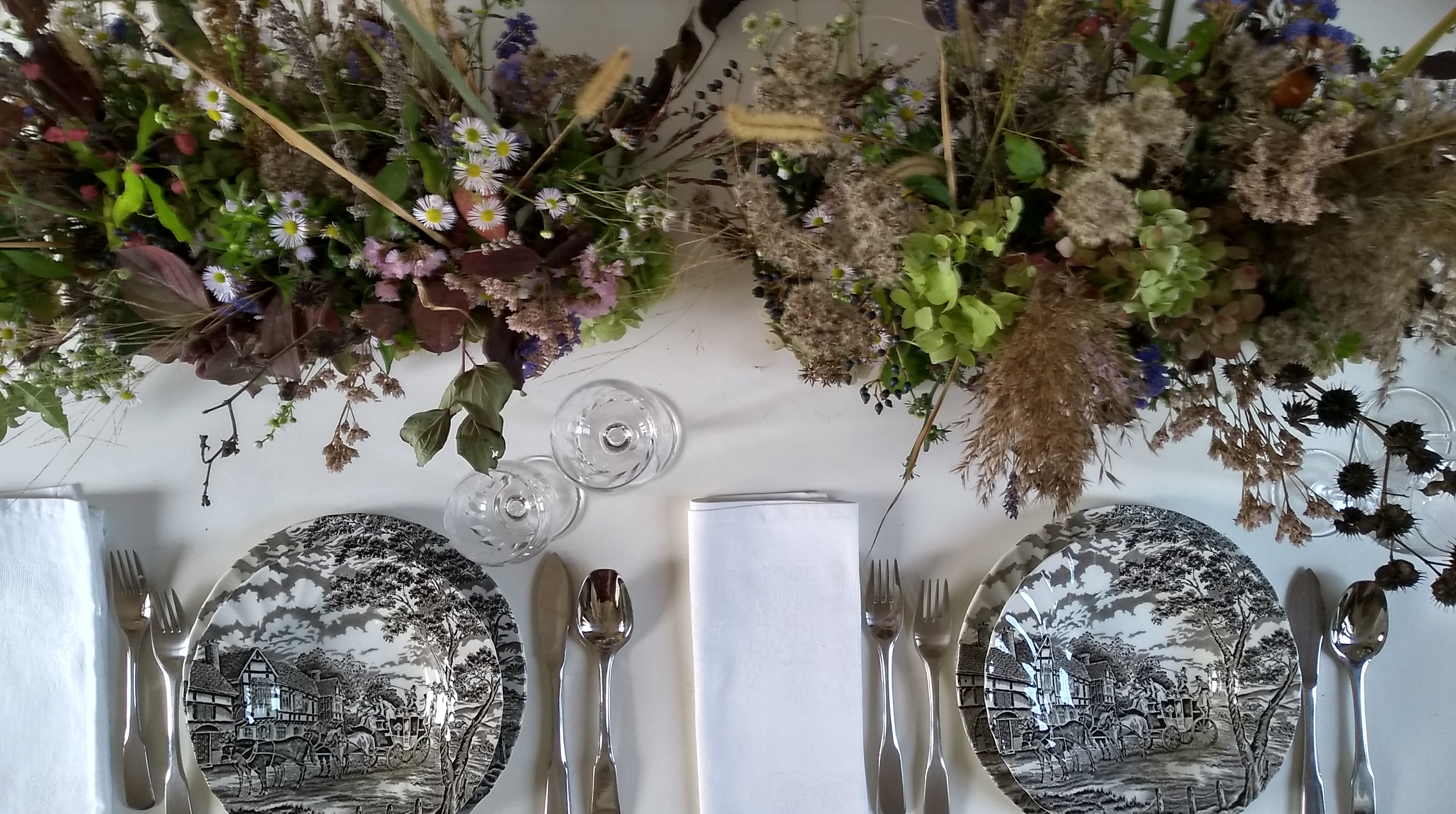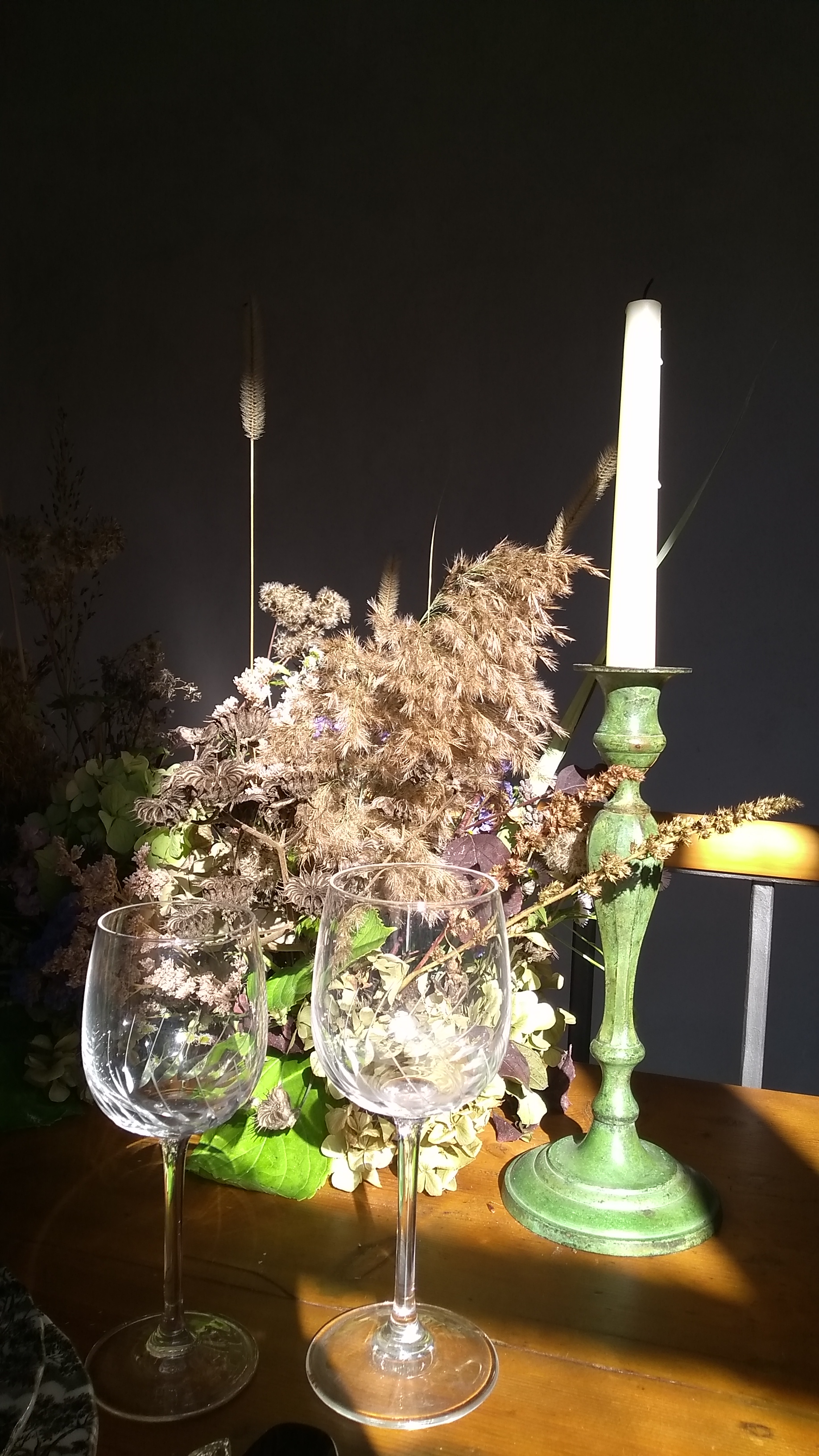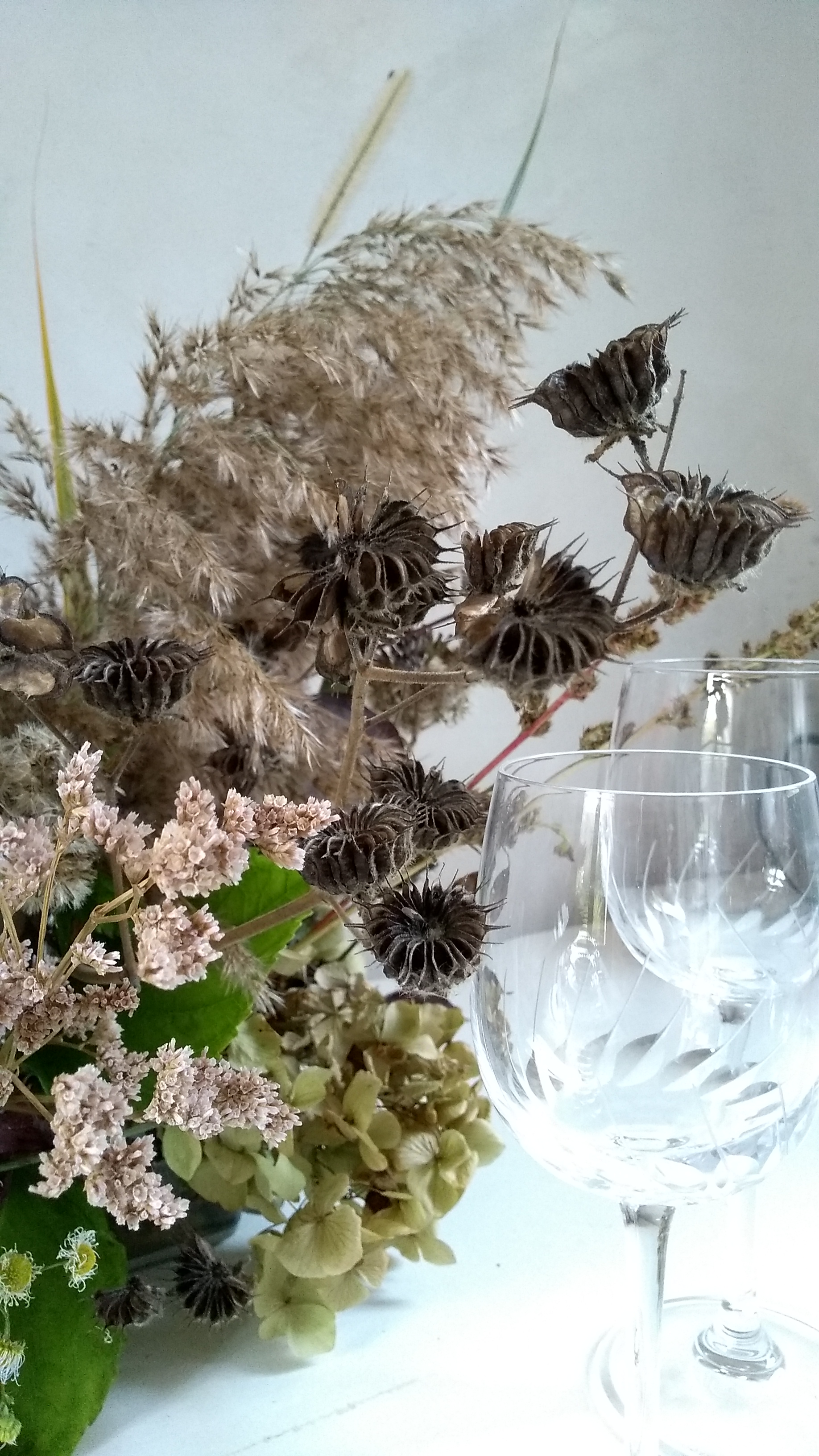 - Fiori, foglie, rami di stagione et slow, cioé raccolti/coltivati nella vostra zona, possibilmente con metodi naturali. A seconda della stagione e del mood che volete realizzare potete scegliere quello che preferite. Io ho usato solo materiali e essenze spontanee, un mix di fresco ed essiccato, e colori delicati ma sofisticati per dare voce ad un autunno che non sia sempre rosso, giallo e arancione. Ho usato settembrini selvatici lilla e bianchi, ortensie di varie sfumature, statice essiccato viola e rosa (si conserva per moltissimo tempo e mantiene il suo colore), lavanda, bacche di viburno, fiori di cicoria (solo se li usate in giornata perchè appassiscono in fretta) , cannucce palustri, pampas, graminacee e stramonio essiccato.
