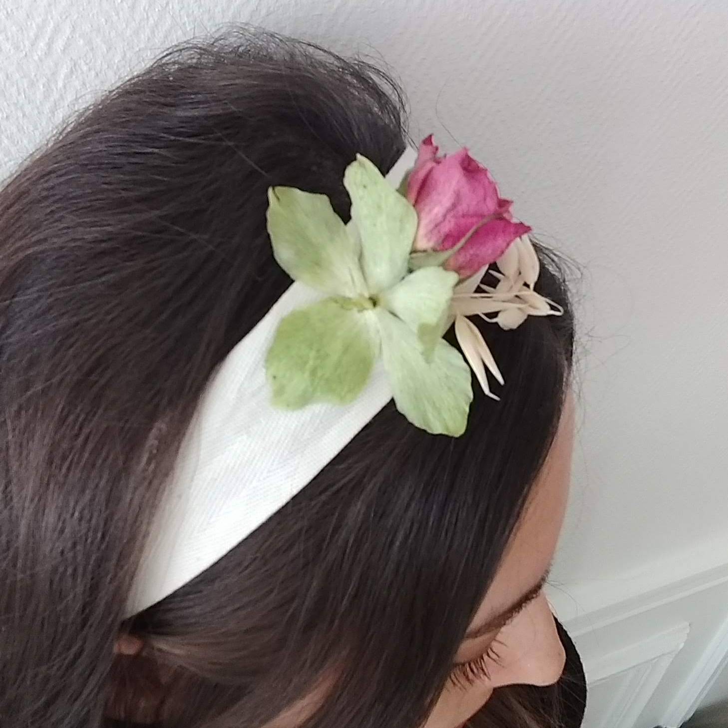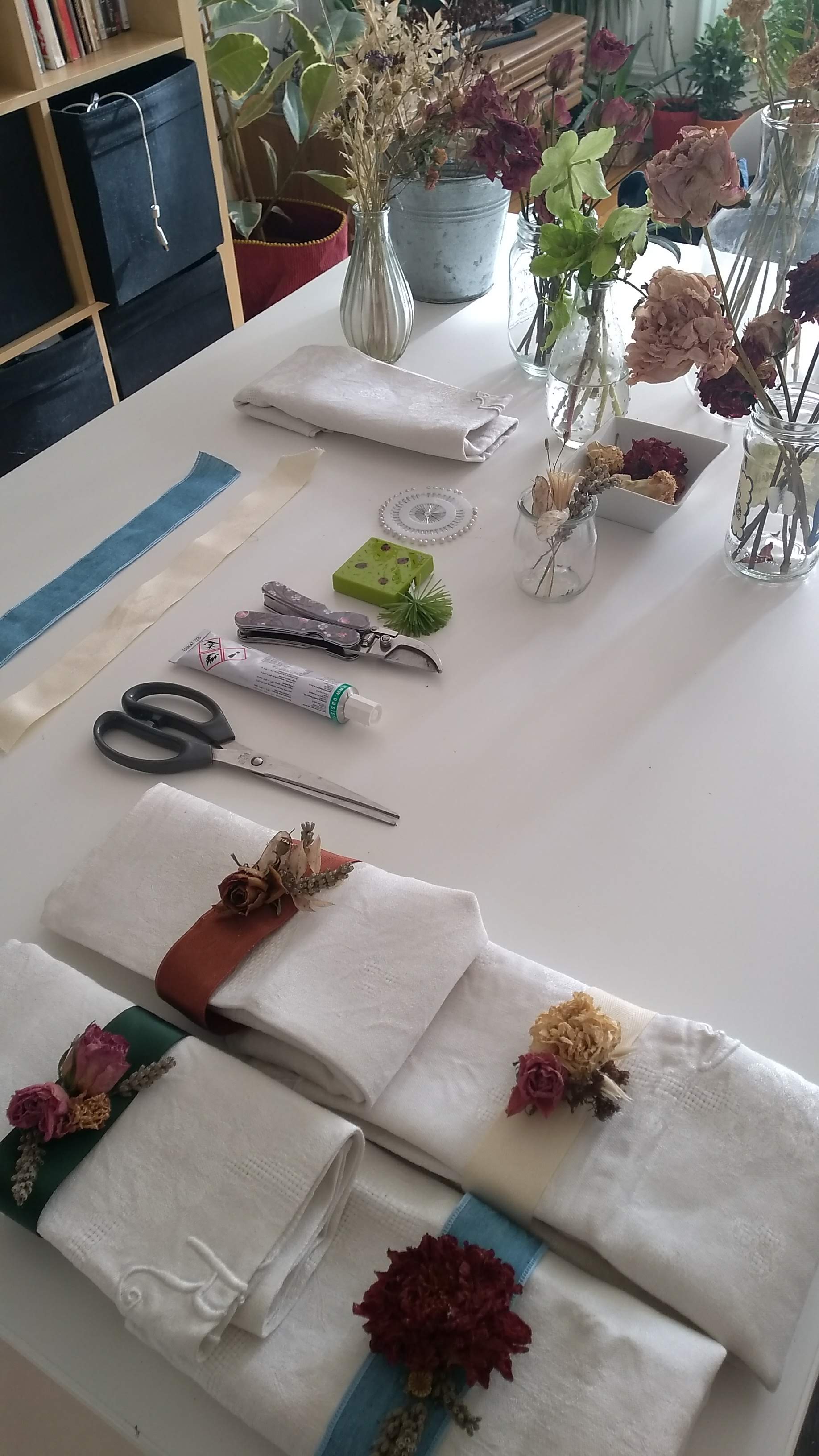 Iniziate scegliendo il nastro che preferite: io vi consiglio tessuti in cotone o lino, mentre eviterei il raso troppo lucido e a rischio “macchia di colla”. Ve ne serviranno 30 cm circa (state abbondanti in modo da poter riutilizzare il ferma tovagliolo come braccialetto); chiudetelo con uno spillo in modo da formare una circonferenza nella quale infilare il tovagliolo e scegliete i fiorellini da attaccare. Con un po’ di colla fissate i fiori al nastro : vi consiglio di privilegiare solo un fiore come focus e di utilizzare fiorellini più piccoli per completare la decorazione. Attenzione se usate la colla a caldo, meglio evitarla se si tratta di fiori freschi perchè potrebbe rovinare il fiore. Una volta completata questa operazione lasciate asciugare 20/30 minuti circa.