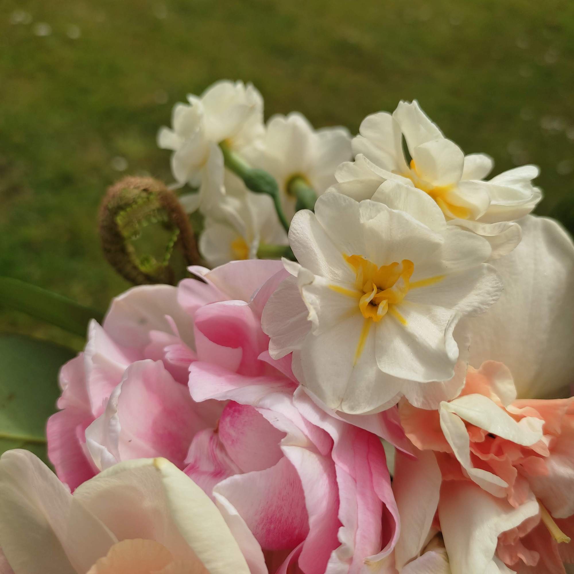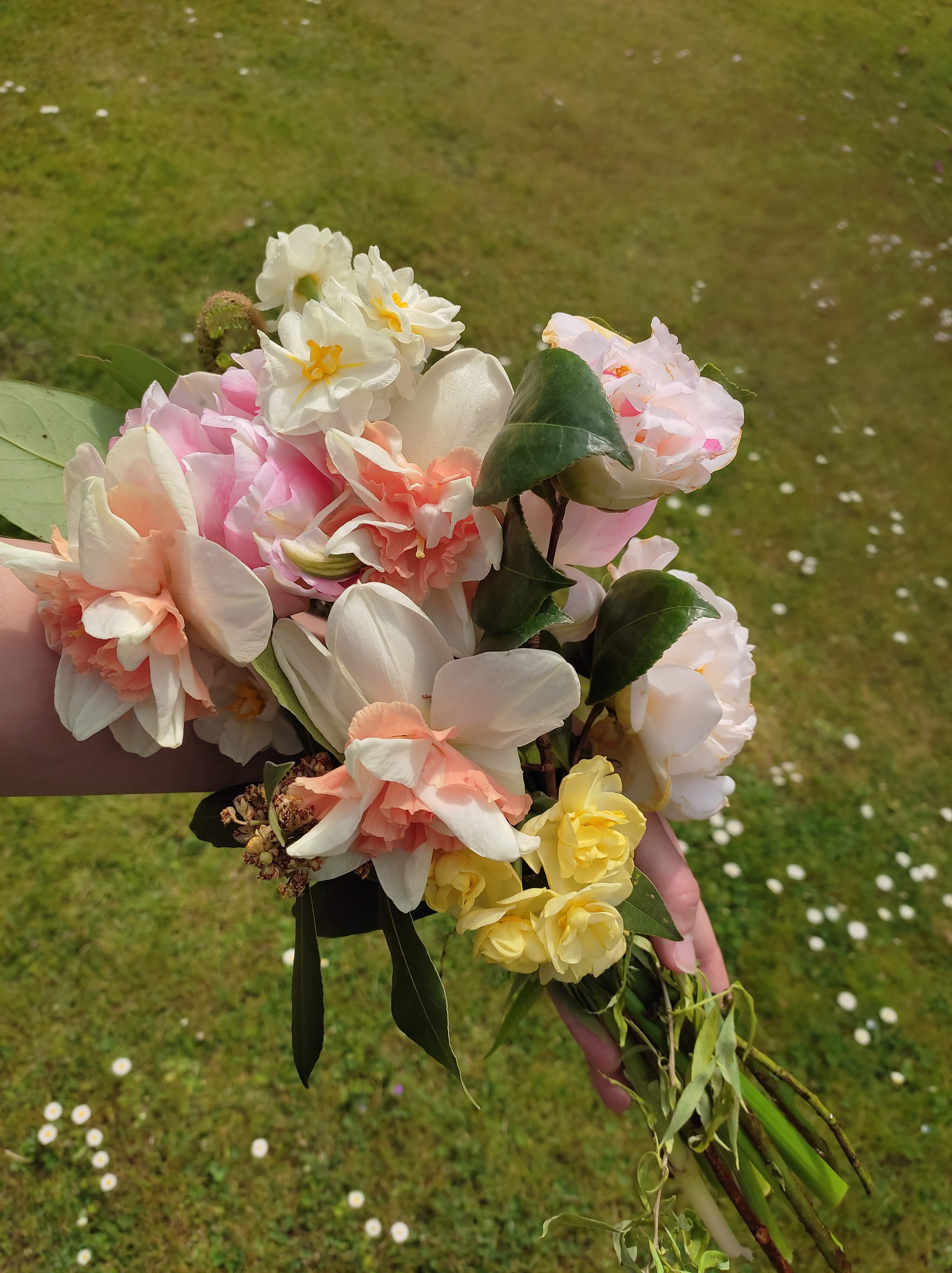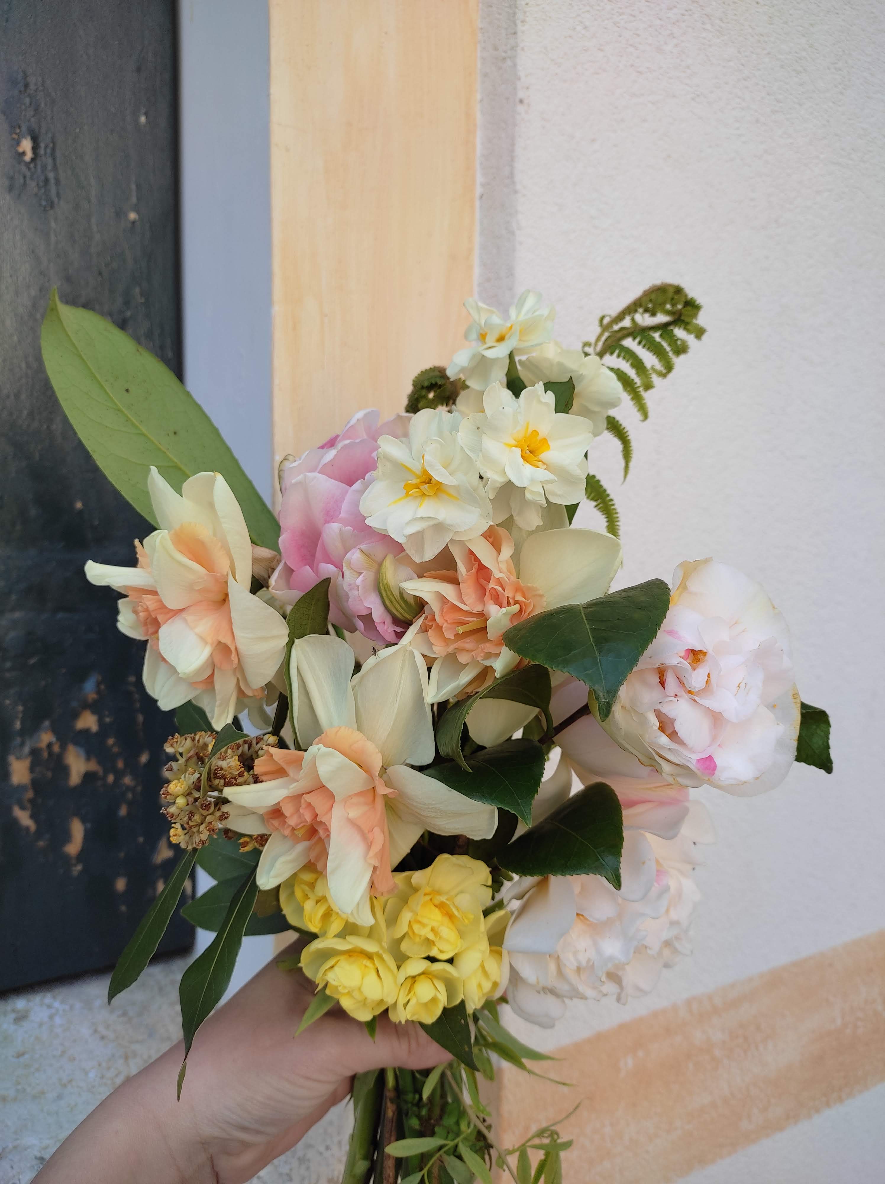 Per la composizione del bouquet ho scelto essenze primaverili, coltivate o spontanee. Nel bouquet ho assemblato fiori che crescono nel mio giardino e fiori coltivati in una piccola flower farm della zona*.