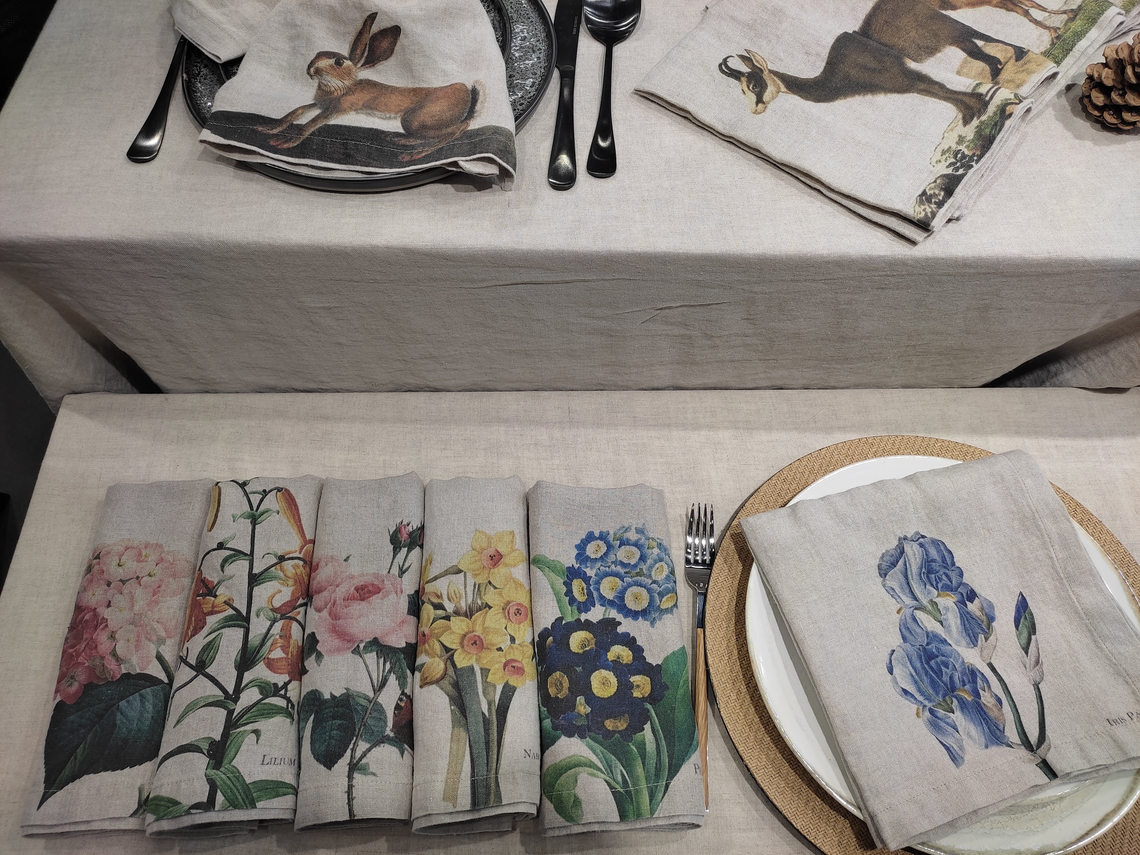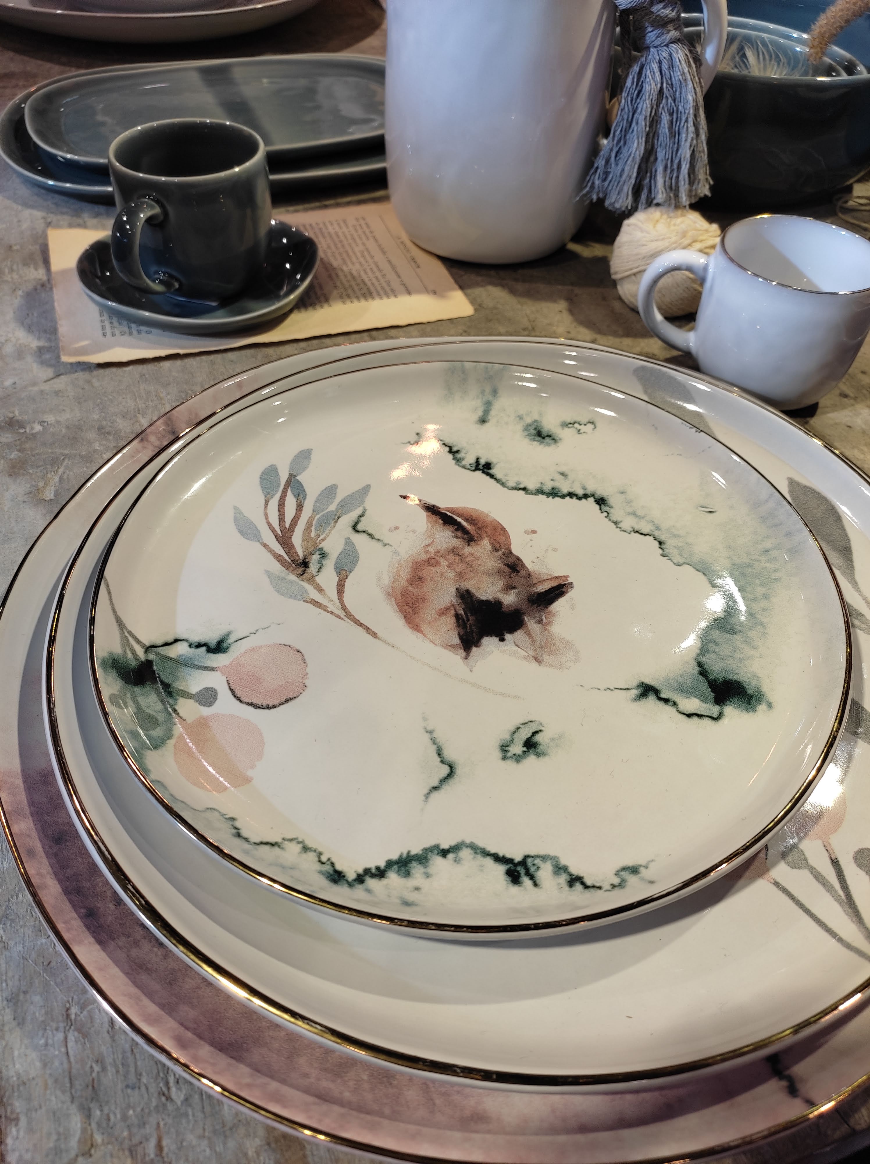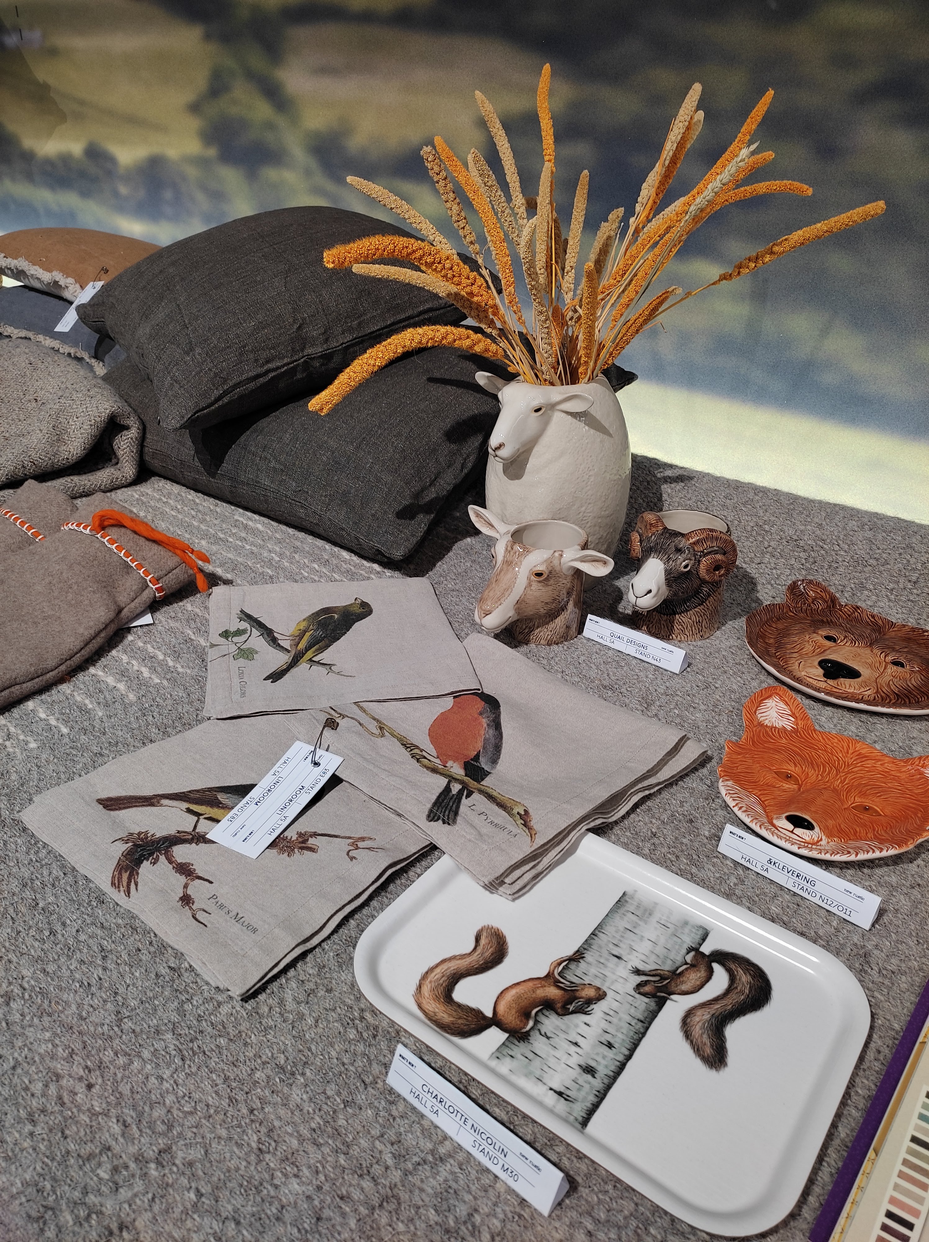 Un’altra tendenza che si delinea con chiarezza è quella derivante dall’immaginario fiabesco. Tessili e oggetti richiamano il mondo incantato del bosco con i suoi animali selvatici, i fiori spontanei, grandi o minuti, i funghi e gli insetti. Volpi, pettirossi, conigli e cerbiatti sono rappresentati su ceramiche e tovaglie; narcisi, iris e rose antiche rivestono parure da letto e diventano protagonisti delle carte da parati. Forme di animali realizzate in terracotta, ceramica o lana cotta fungono da contenitori e elementi decorativi mentre materiali grezzi come il lino o il feltro sono largamente impiegati per tovaglie, runner e cuscini. Salvo per qualche motivo di ispirazione naif, i colori sono delicati e naturali, richiamandosi alle tonalità del bosco autunnale.
