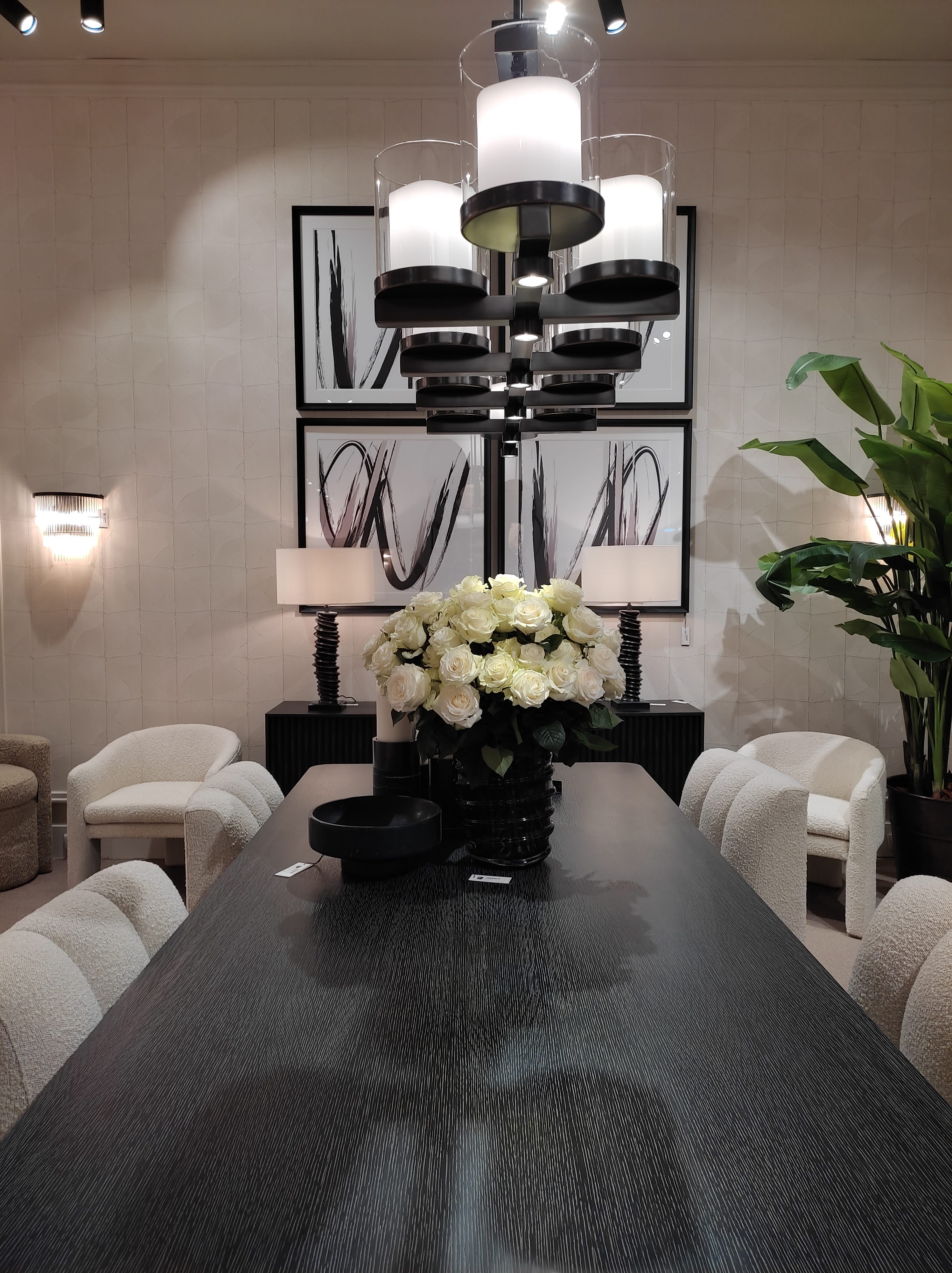 Grande classico dell’arredamento, l’abbinamento bianco e nero è stato per lungo tempo associato ad uno stile minimalista. Quest’anno i due “colori-non-colori” sono impreziositi da dettagli oro che denotano opulenza e conferiscono un’aura déco all’insieme. Le sedute sono ampie, in soffice tessuto bouclé, bianco o avorio; marmo, legno scuro dalla finitura brillante o mat, e superfici in specchio sono i materiali privilegiati per tavoli e tavolini. Abat-jour e lampadari in vetro o cristalli richiamano invece uno stile rétro. Il tavolo dalla superficie scura, nera o ebano, è lasciato senza tovaglia per mises en place ton-sur-ton; optical e lineari oppure artigianali e materiche, le ceramiche per la tavola si declinano anch’esse sui toni del bianco, nero, con tocchi di oro.