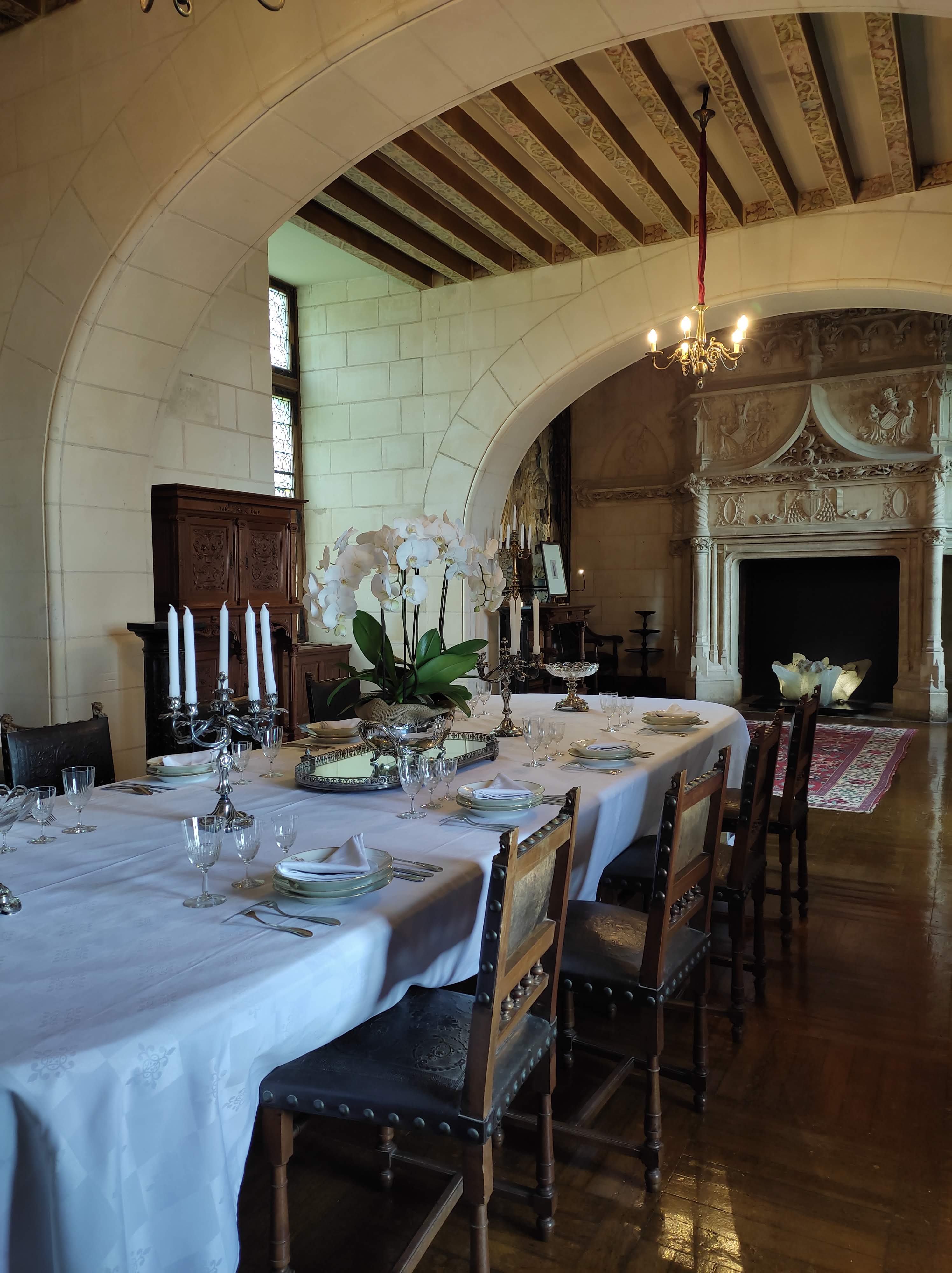 La tavola era ricoperta di argenteria splendente che scintillava alla luce delle candele poste su alti candelabri d’argento a 8 o 10 braccia. Una composizione di orchidee verdi striate di marrone decoravano il centro della tavola. La biancheria da tavola era superba. Tra i succulenti piatti preparati per il duca vi era il Pavone di Chaumont, molto reputato in quanto si nutriva di germogli di cedro che conferivano un aroma particolare alla sua carne succulenta.