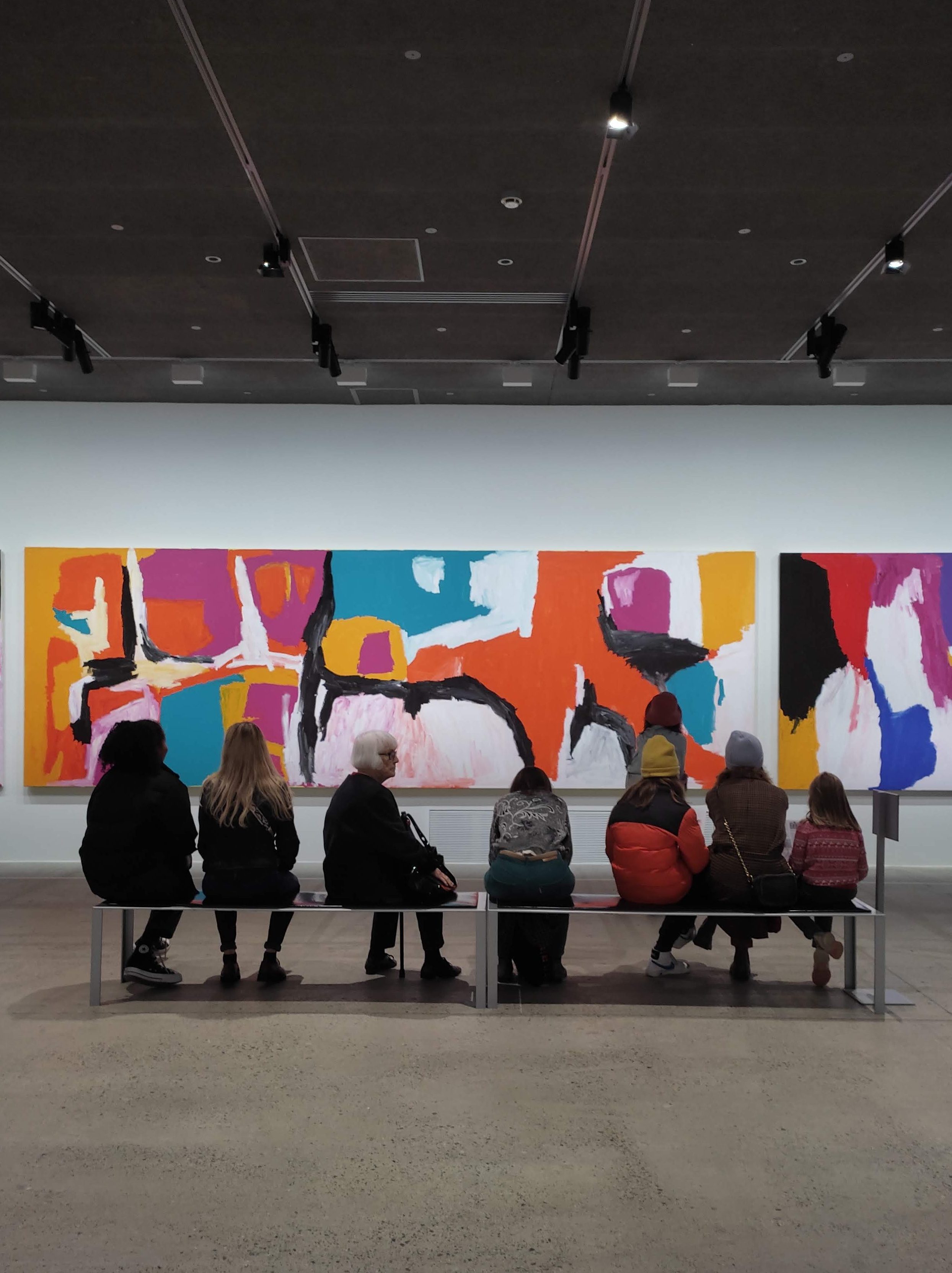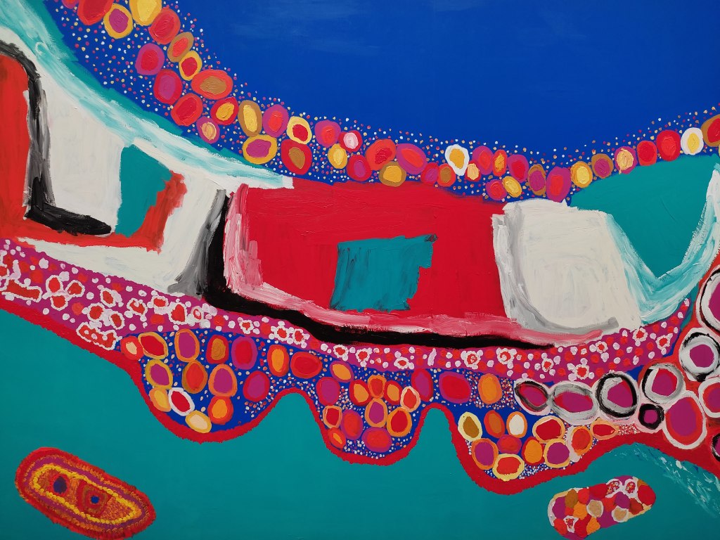 In apparenza astratti, i dipinti di Sally Gabori celebrano l’isola natale, i fenomeni naturali e metereologici, il mare, la terra, il cielo e le persone significative nella vita dell’artista. Le sue opere costituiscono quindi dei riferimenti topografici e dei racconti dal significato profondo che affondano le radici nella memoria collettiva di un popolo e nella sua cosmogonia. Testimonianza di un immaginario dagli orizzonti illimitati e di una impressionante libertà formale, le tele combinano colori, vivi e materici, e forme.